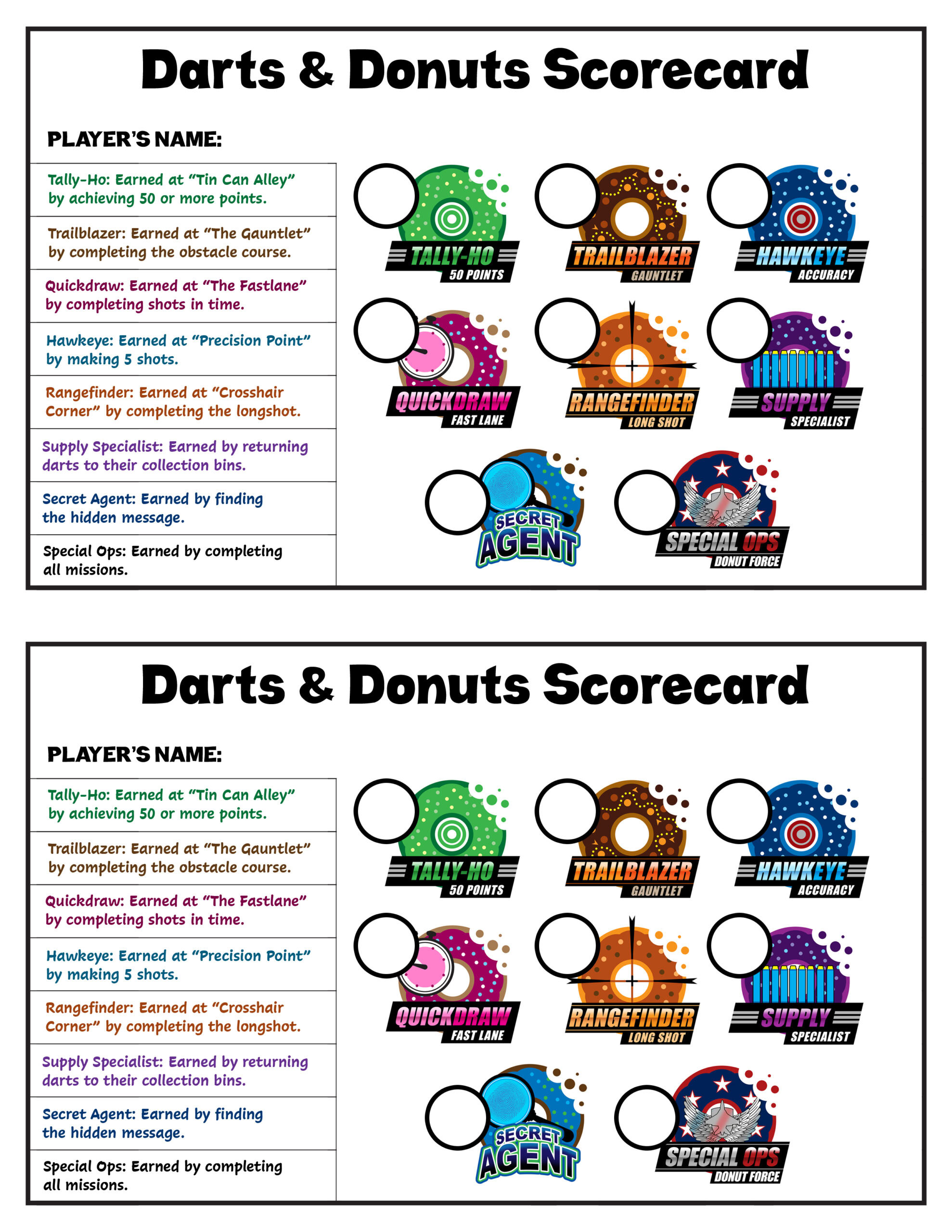 • Printable game instructions- for a variety of dart challenges that work for all ages and skill levels. More than 20 unique signs and instructions are provided for each theme. Participants also have the task of earning achievements throughout the night, those achievements are included as well, along with different options for tracking these achievements.